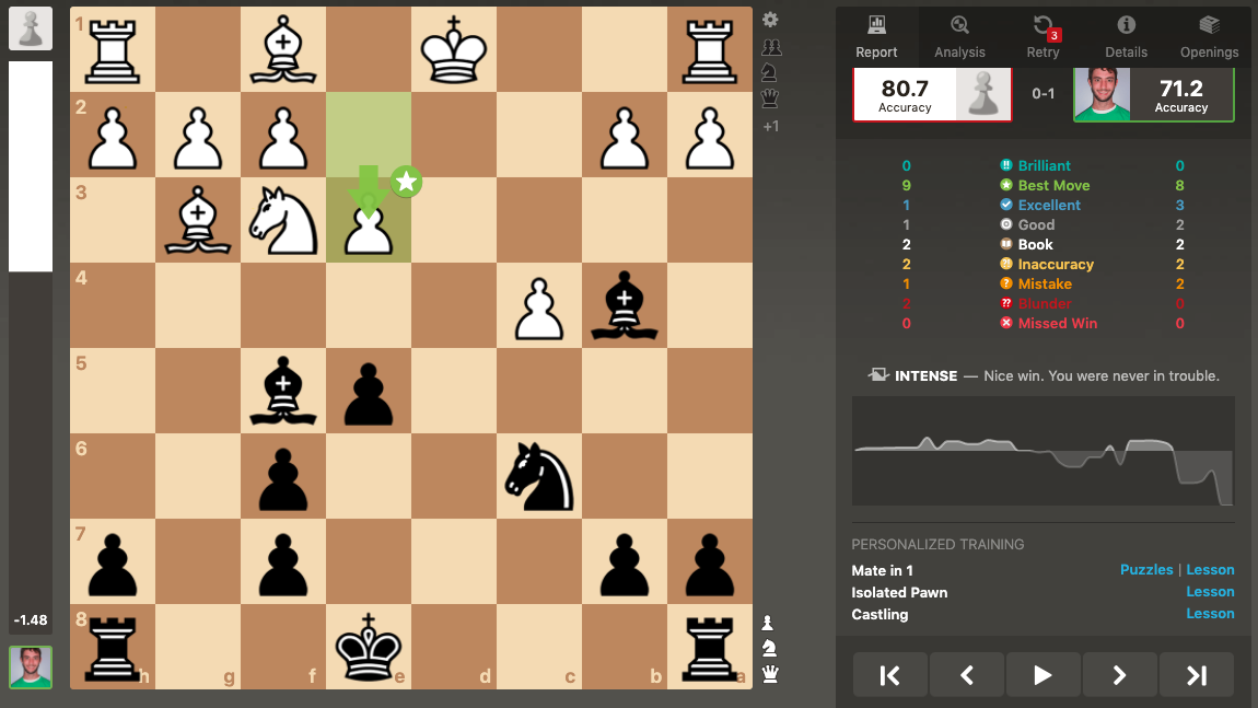 Chess.com’s computer says, “INTENSE – Nice win. You were never in trouble.”