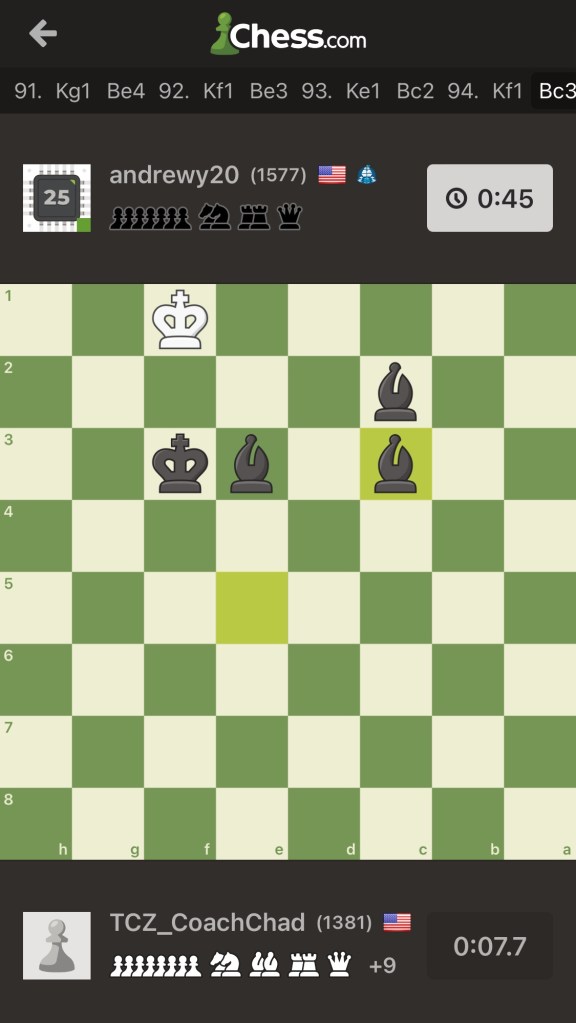 Game 5: Another Borg-burner classical comeback by Coach Chad with a dubious attempt at the triple bishop mate leading to a laughable stalemate — take a break (ooof)— Check out this #chess game: andrewy20 vs TCZ_CoachChad – https://www.chess.com/live/game/109986086155