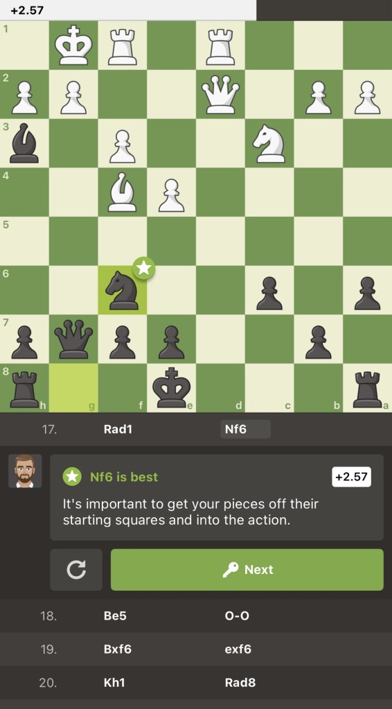— frankly speaking black actually has played multiple great moves throughout the game.. and although this next position looks quite suspect—white seems to have objectively achieved better development, at least with regards to King safety —yet the position is certainly worth a deep look..because the obvious plan of Be5 (pinning the Knight on F6 to the Queen on G7) has multiple not so-obvious yet absolutely great (and necessary) counter play ideas (half-open G-file attacks utilizing a strange rook on G8 have become a common theme in the Borg) — so white might be tempted to dawdle or even blunder amongst such a tense position once they’ve considered how black is coordinating chaotic attacks everywhere and deftly defending everything else..the endgames are all bluffs at this point..don’t tilt too soon!