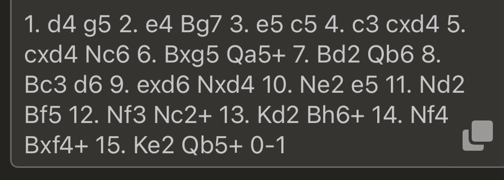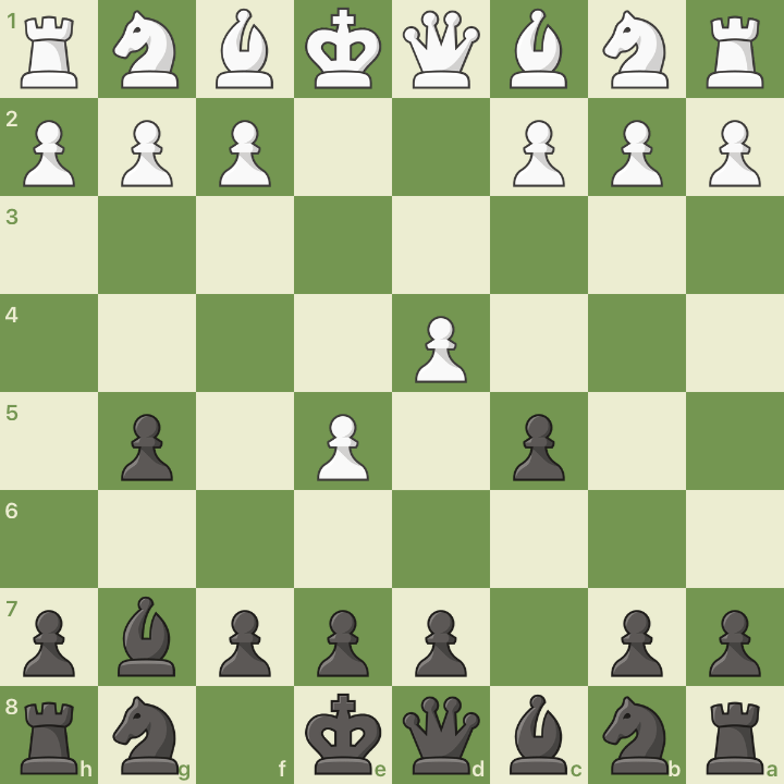 - d4 g5 2. e4 Bg7 3. e5 c5 4. c3 cxd4 5. cxd4 Nc6 6. Bxg5 Qa5+ 7. Bd2 Qb6 8.