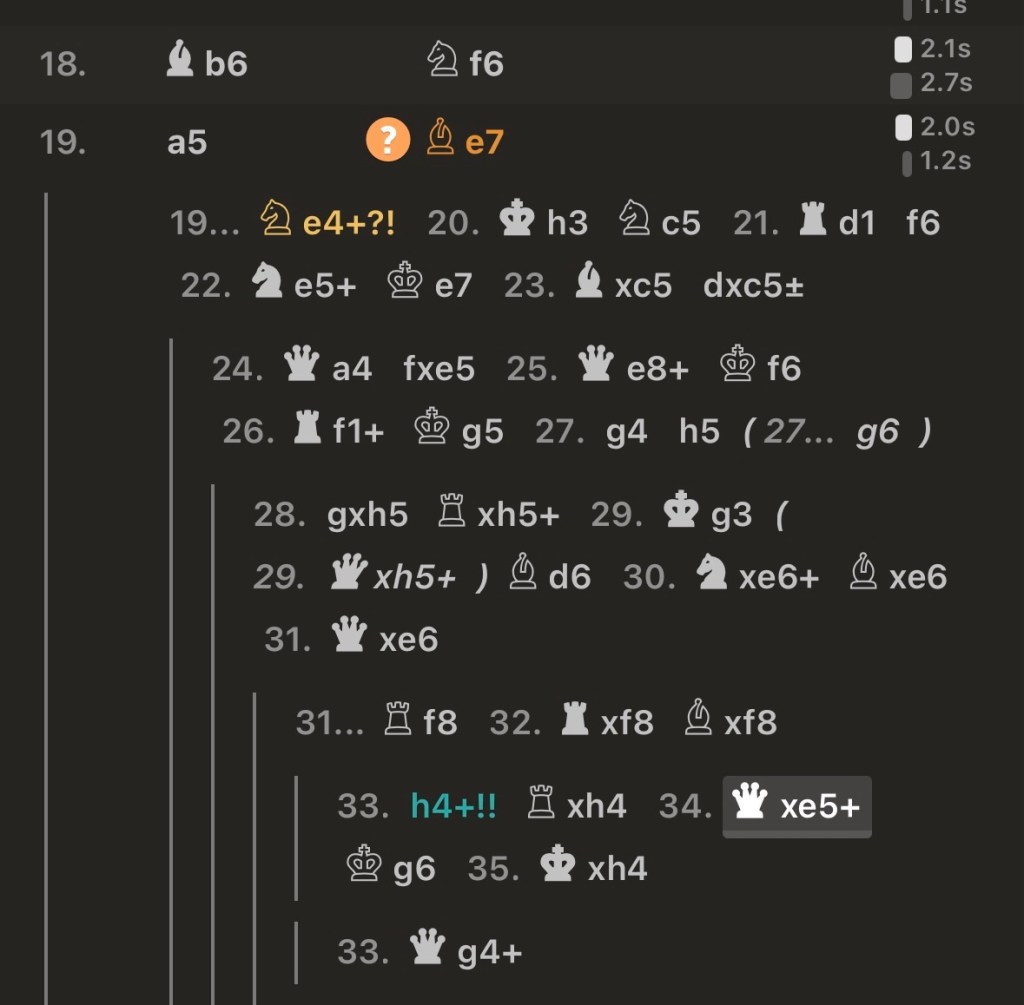 19… Ne4+!? 20. Kh3 Nc5 21. Rd1 f6 22. Ne5+ Ke7 23. Bxc5 dxc5 24. Qa4 fxe5 25. Qe8+ Kf6 26. Rf1+ Kg5 27. g4 h5 28. gxh5 Rxh5+ 29. Kg3 Bd6 30. Nxe6+ Bxe6 31. Qxe6 Rf8 —- pause and see below