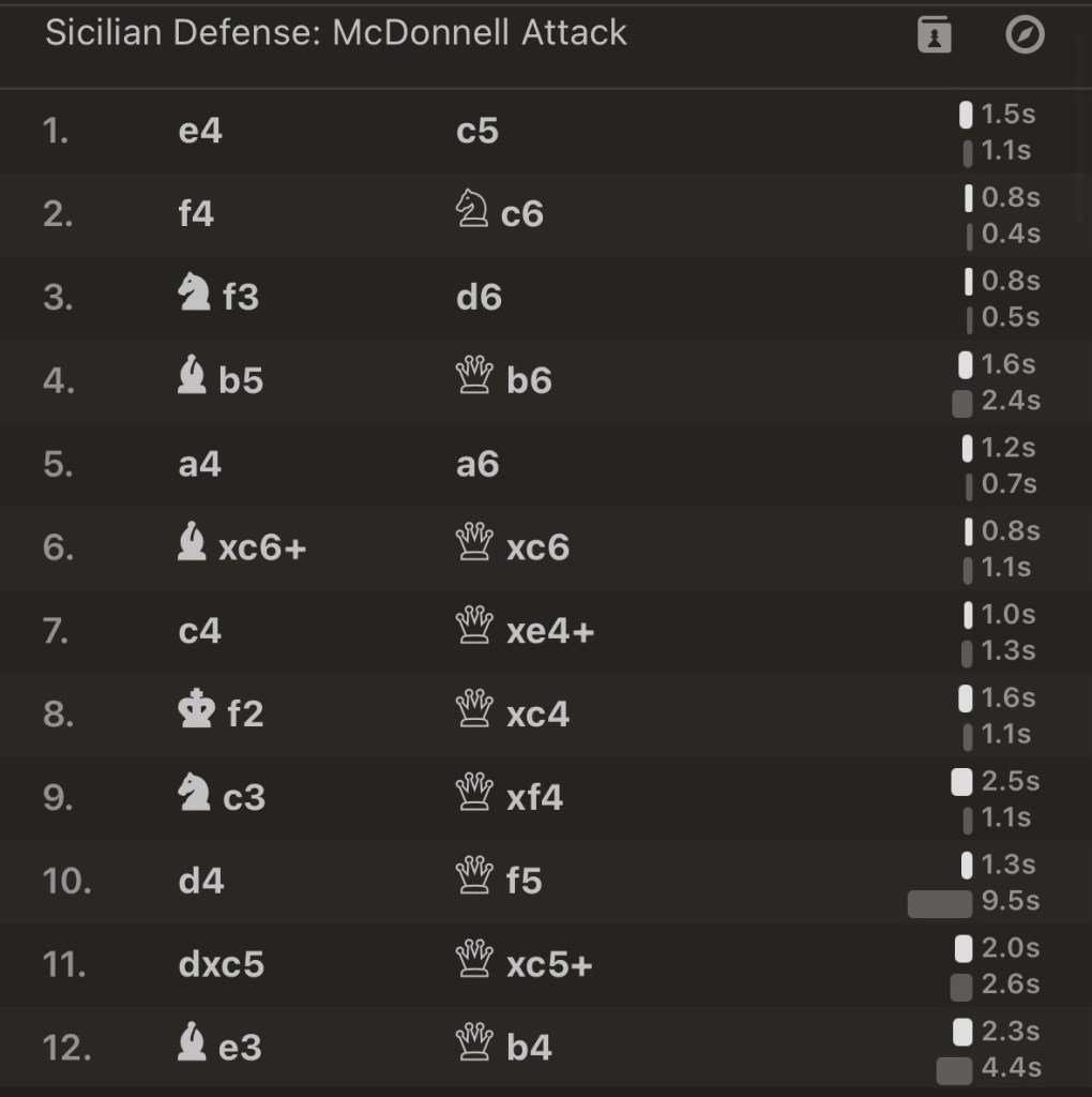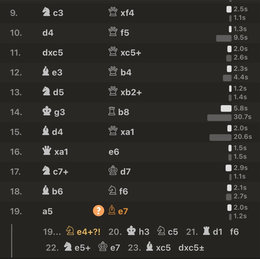 - e4 c5 2. f4 Nc6 3. Nf3 d6 4. Bb5 Qb6 5. a4 a6 6. Bxc6+ Qxc6 7. c4 Qxe4+ 8. Kf2 Qxc4 9. Nc3 Qxf4 10. d4 Qf5 11. dxc5 Qxc5+ 12. Be3 Qb4 13. Nd5 Qxb2+ 14. Kg3 Rb8 15. Bd4 Qxa1 16. Qxa1 e6 17. Nc7+ Kd7 18. Bb6 Nf6 19. a5 Be7? (19… Ne4+!? 20. Kh3 Nc5 21. Rd1 f6 22. Ne5+ Ke7 23. Bxc5 dxc5+- 24. Qa4 (24. Qa3) (24. Nd5+)