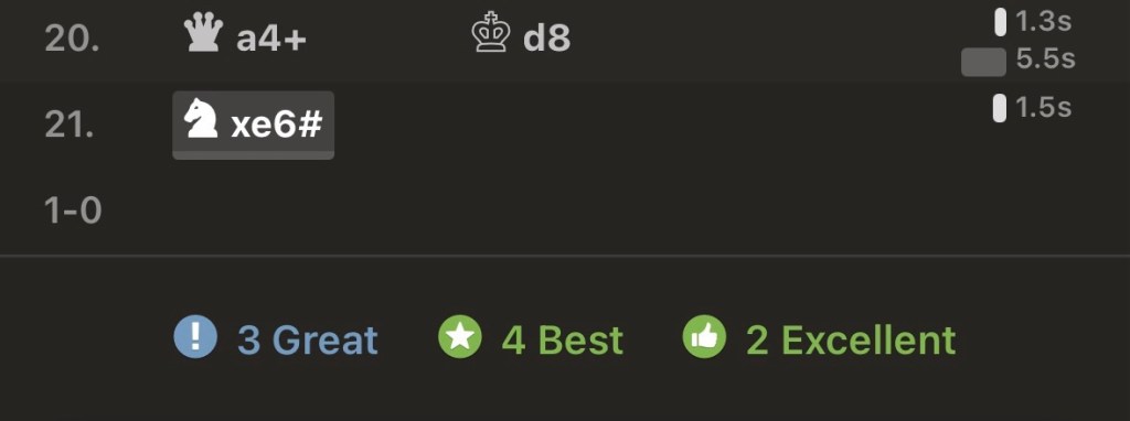 Qg8) (33. Kf3) (33. Qc8) (33. Qd5) (33. Qd6) (33. Qc6) (33. Qxe5+) 33… Rxh4 34. Qxe5+ Kg6 35. Kxh4) 20. Qa4+ Kd8 21. Nxe6# 1-0