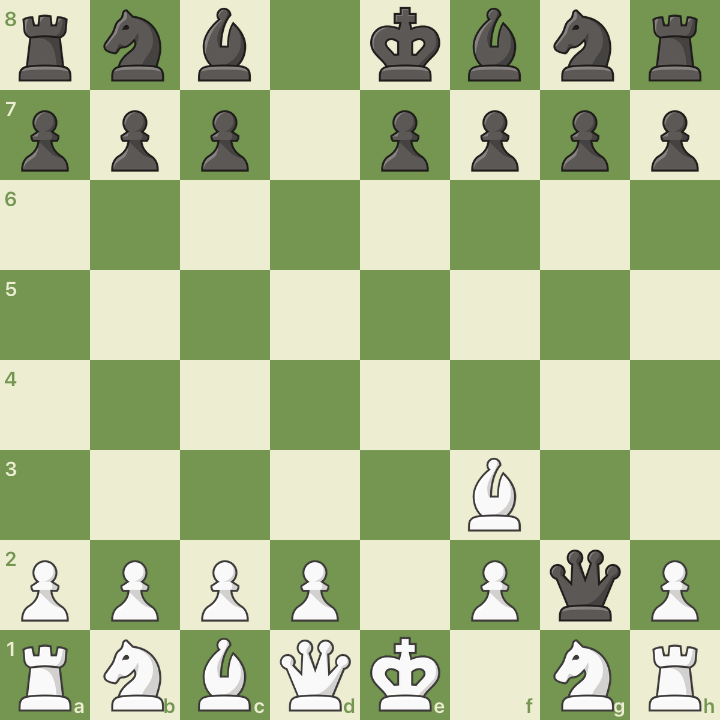 - e4 d5 2. exd5 Qxd5 3. Be2 Qxg2 4. Bf3 Qg6 5. d4 Qe6+ 6. Kf1 Qc4+ 7. Kg2 e6 8.