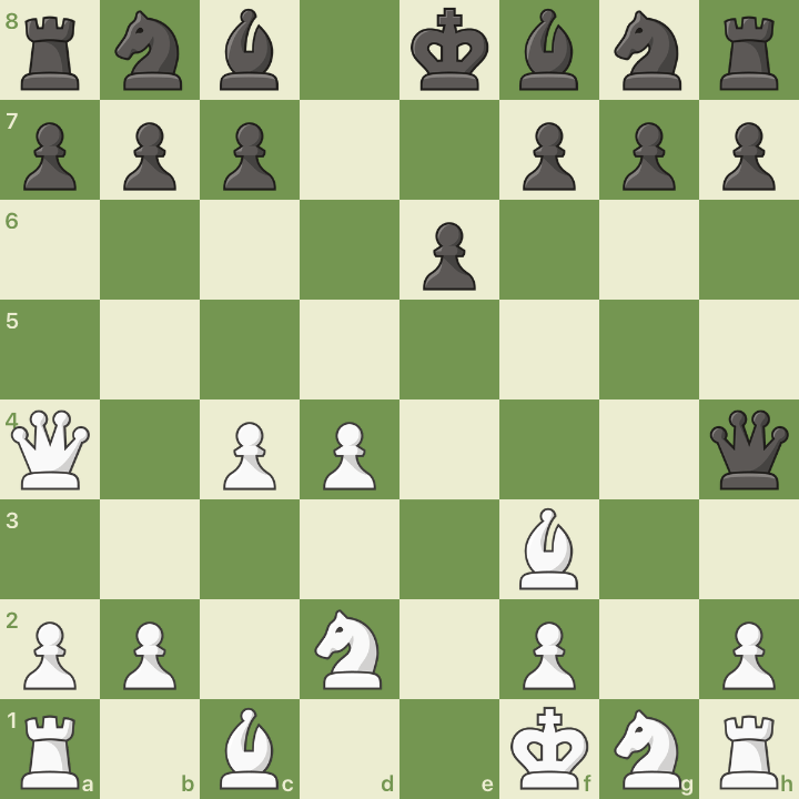 - e4 d5 2. exd5 Qxd5 3. Be2 Qxg2 4. Bf3 Qg6 5. d4 c6 6. c4 e6 7. Nc3 Bb4 8. a3