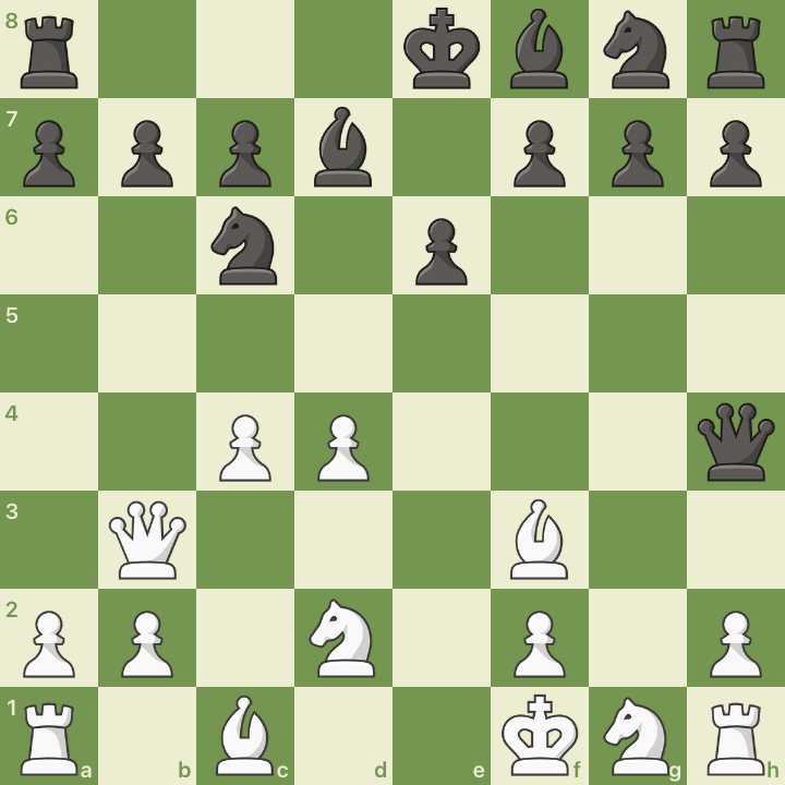Bxc3+ 9. bxc3 Nf6 10. Ne2 O-O 11. Rg1 Qf5 12. Ng3 Qh3 13. Rg2 Nbd7 14. Kf1 e5 15. Kg1 exd4 16. Qxd4 c5 17. Qf4 Qe6 18. Be3 g6 19. Re1 Ne5 20. Bd2 Nxf3+ 21.